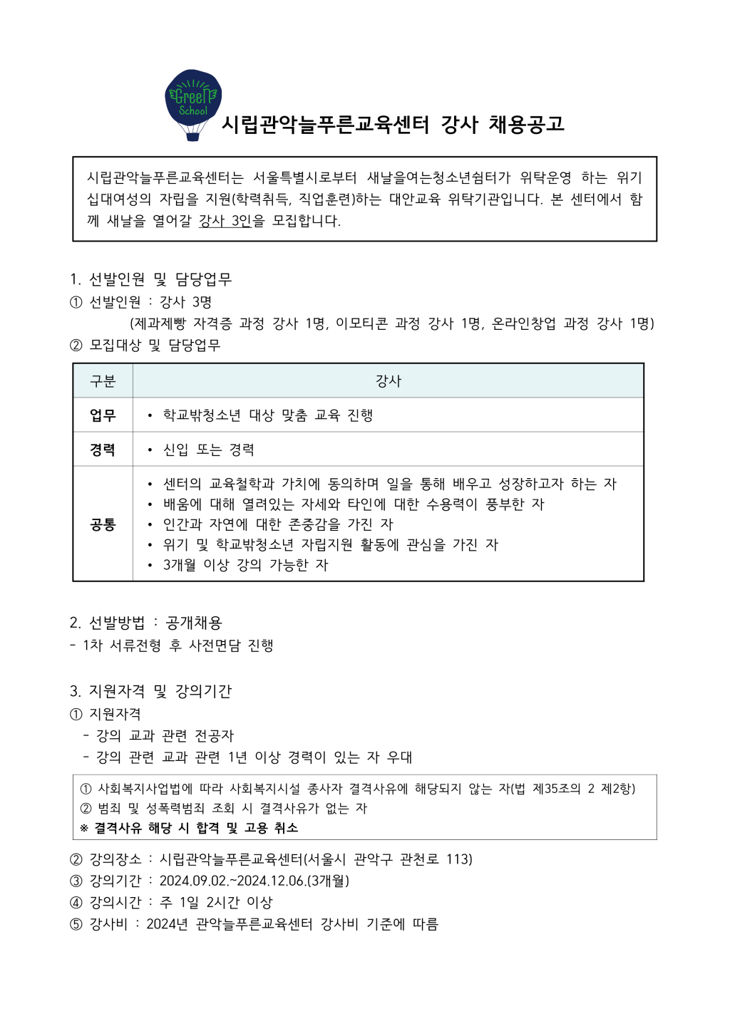 DATE : 2024-07-16 09:25 WRITER : 관리자 VIEW : 1222 시립관악늘푸른교육센터 강사 채용공고(제과제빵 자격증 과정, 이모티콘 과정, 온라인창업 과정) 첨부파일 강사채용공고(2024.07).hwp (1.04 MB) blobid1721175116545.png (238.85 KB) blobid1721175156944.png (123.59 KB) 목록 다음 강사 채용 최종합격자 공고 이전 2024년도 3차 실무교사 채용 최종 합격자 공고 로그인 후 댓글을 작성할 수 있습니다.