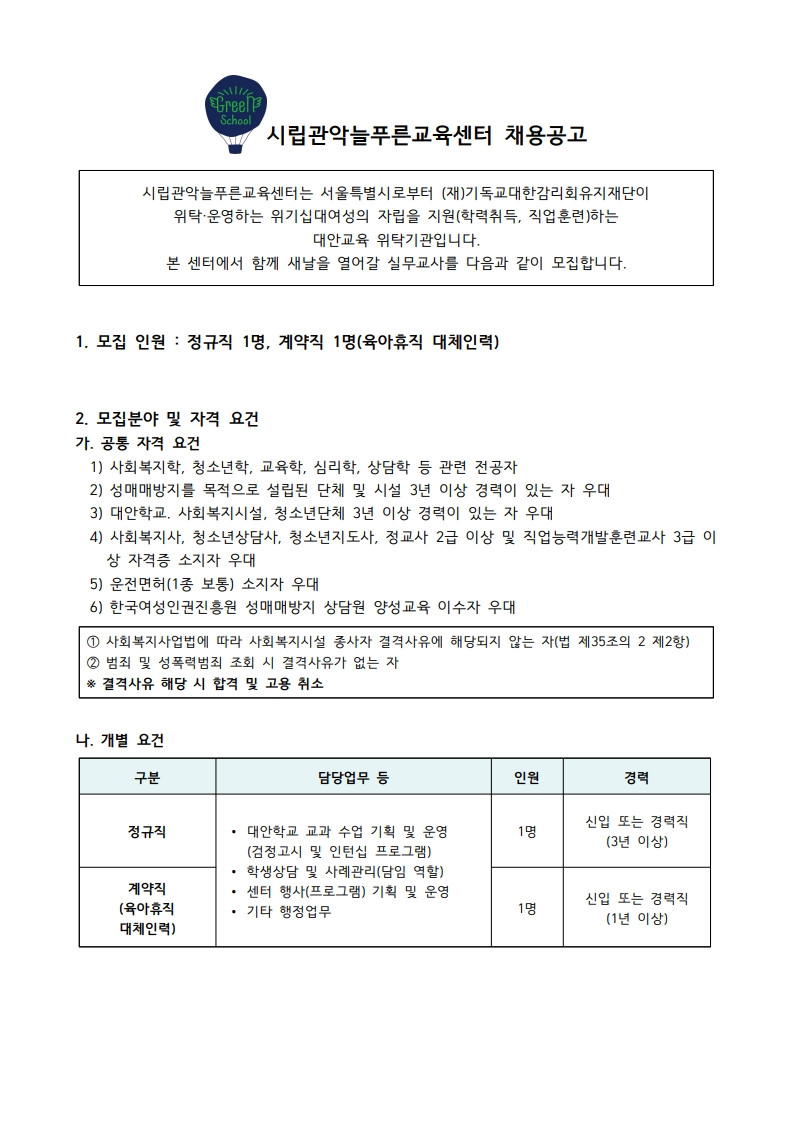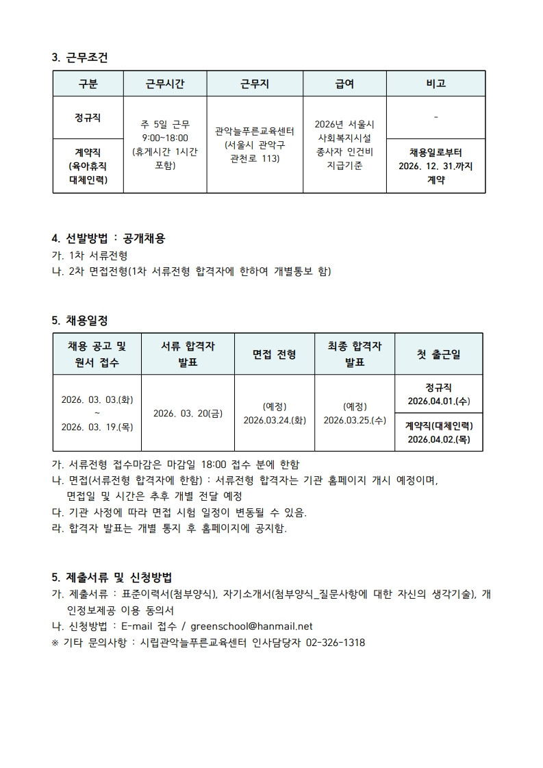 DATE : 2026-03-03 00:00 WRITER : 관리자 VIEW : 205 [26년도-1차] 시립관악늘푸른교육센터 실무교사(정규직 및 계약직_육아휴직대체) 채용공고 첨부파일 26-1차 채용공고_(정규직, 육아휴직 대체)_1.jpg (161.01 KB) 26-1차 채용공고_(정규직, 육아휴직 대체)_2.jpg (154.85 KB) 26-1차 채용공고_첨부서류(표준이력서 등).hwp (82.50 KB) 26-1차 채용공고_(정규직, 육아휴직 대체).hwp (80.00 KB) 목록 이전 2026년 시립관악늘푸른교육센터 검정고시 교과 자원봉사자 모집 로그인 후 댓글을 작성할 수 있습니다.