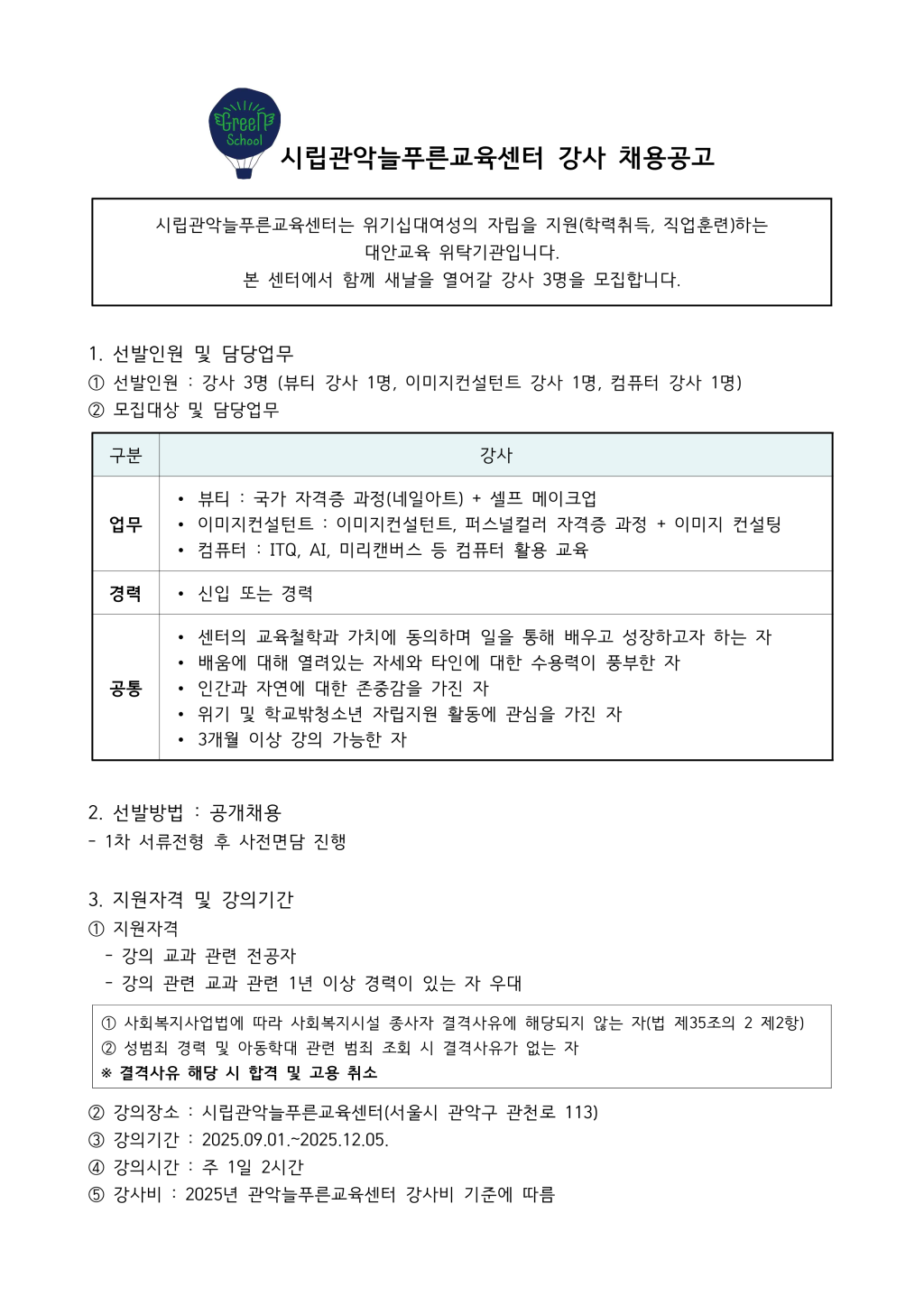DATE : 2025-08-13 10:37 WRITER : 관리자 VIEW : 346 시립관악늘푸른교육센터 강사 채용공고(뷰티 과정, 이미지컨설턴트 과정, 컴퓨터 과정)(수정) 첨부파일 강사채용공고(2025.08)_1.png (248.71 KB) 강사채용공고(2025.08)_2.png (293.91 KB) 강사채용공고(2025.08).hwp (154.50 KB) 목록 다음 [25년도-2차] 시립관악늘푸른교육센터 회계·행정 전담직(경력직) 채용공고 이전 [25-1차] 시립관악늘푸른교육센터 실무교사 채용 최종합격자 공고 로그인 후 댓글을 작성할 수 있습니다.