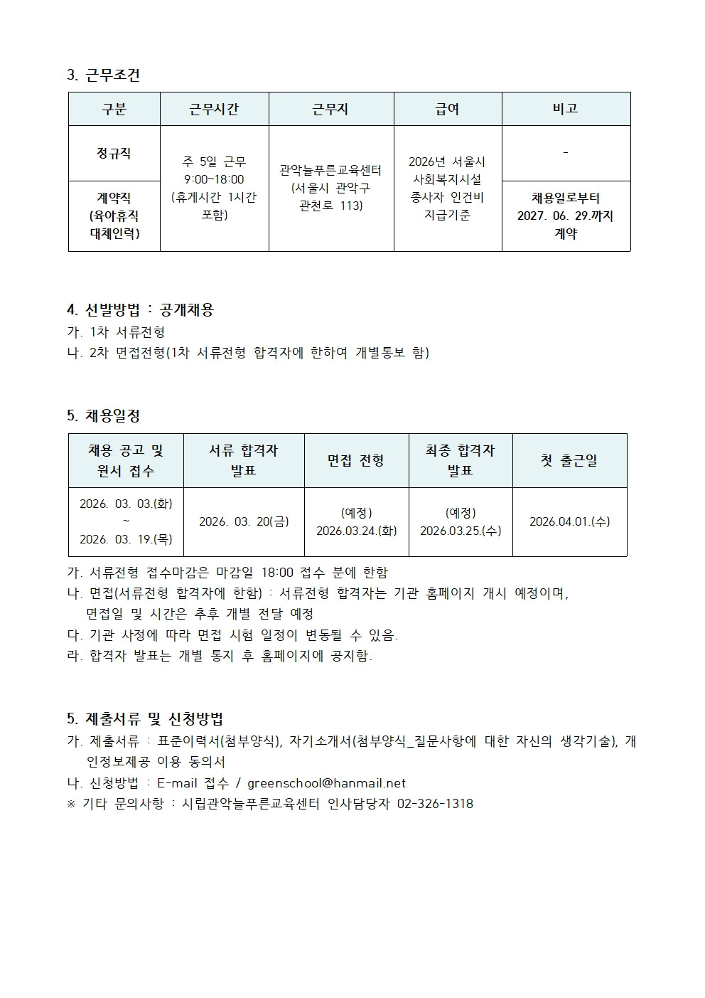 DATE : 2026-03-03 00:00 WRITER : 관리자 VIEW : 16 [26년도-1차] 시립관악늘푸른교육센터 실무교사(정규직 및 계약직_육아휴직대체) 채용공고 첨부파일 26-1차 채용공고_(정규직, 육아휴직 대체)001.jpg (233.31 KB) 26-1차 채용공고_(정규직, 육아휴직 대체)002.jpg (202.71 KB) 26-1차 채용공고_첨부서류(표준이력서 등).hwp (82.50 KB) 26-1차 채용공고_(정규직, 육아휴직 대체).hwp (80.00 KB) 목록 이전 2026년 시립관악늘푸른교육센터 검정고시 교과 자원봉사자 모집 로그인 후 댓글을 작성할 수 있습니다.