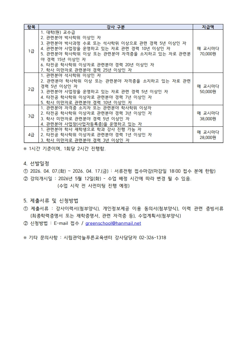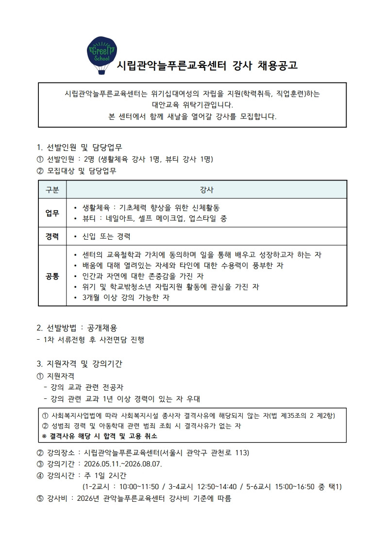 DATE : 2026-04-07 10:58 WRITER : 관리자 VIEW : 21 시립관악늘푸른교육센터 강사 채용공고(뷰티 과정, 생활체육 과정) 첨부파일 강사채용공고(2026.04).hwp (85.50 KB) 강사채용공고(2026.04)_1.jpg (171.87 KB) 강사채용공고(2026.04)_2.jpg (192.70 KB) 목록 이전 [26-1차] 시립관악늘푸른교육센터 실무교사(정규직 및 계약직_육아휴직 대체인력) 채용 최종합격자 공고 로그인 후 댓글을 작성할 수 있습니다.