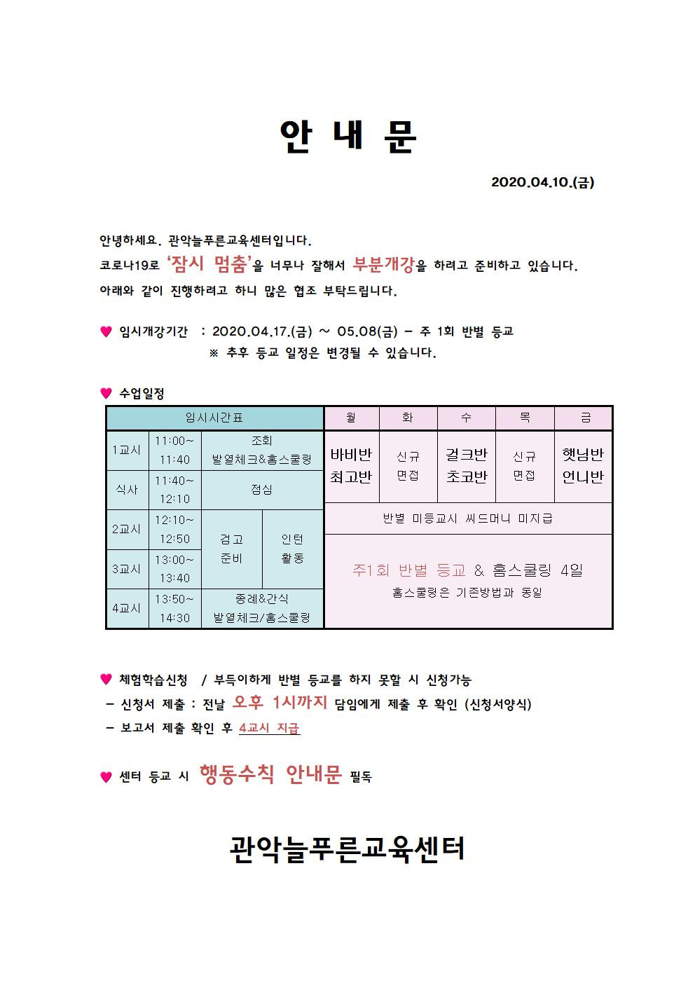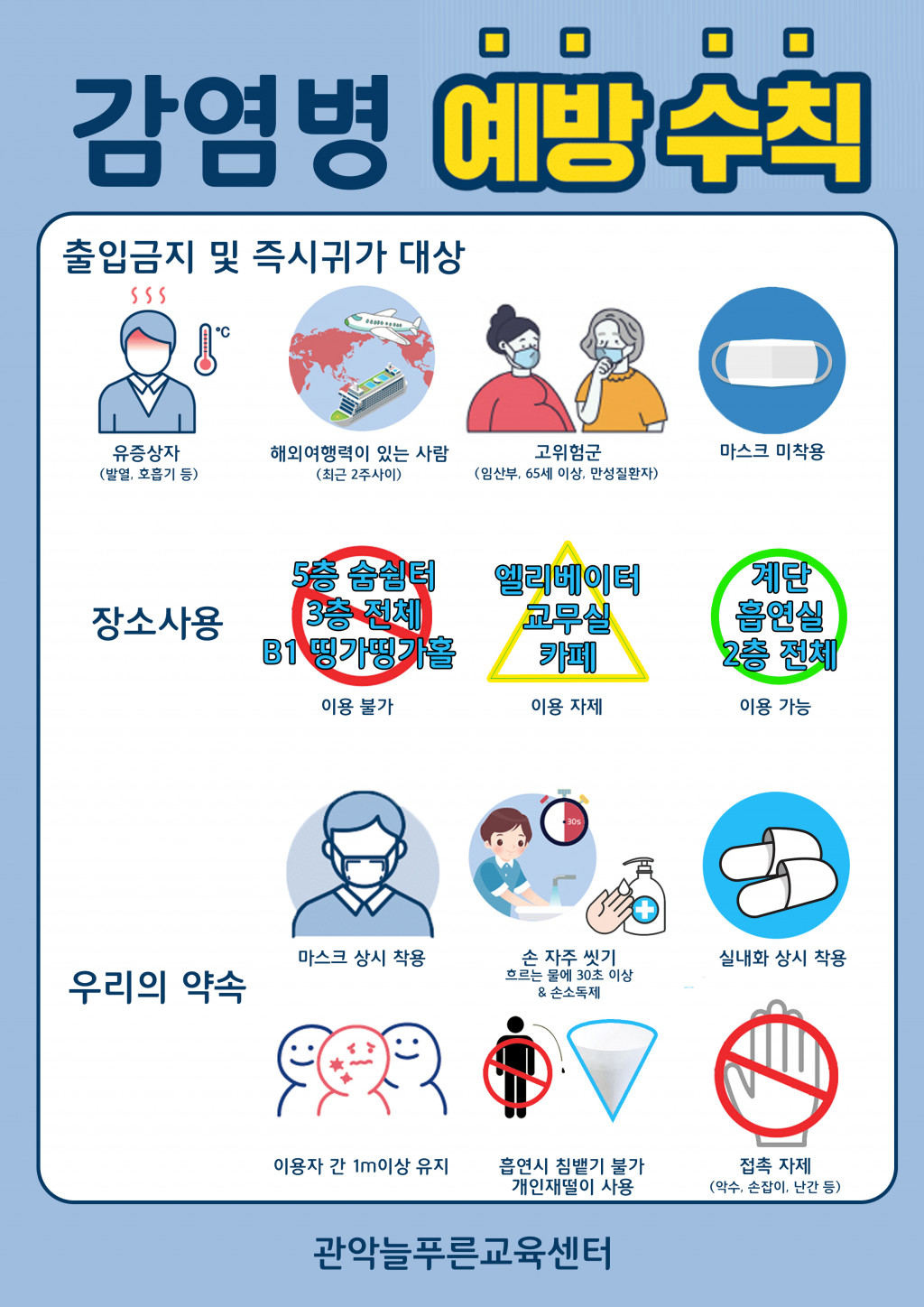 DATE : 2020-04-10 17:23 WRITER : 관리자 VIEW : 2361 관악늘푸른교육센터 내 감염명 '예방수칙' 첨부파일 부분개강안내문.jpg (173.06 KB) 감염병 예방수칙.jpg (331.58 KB) 목록 다음 2020년도 1차 검정고시 일정 추가변경 이전 부분개강 안내문 로그인 후 댓글을 작성할 수 있습니다.