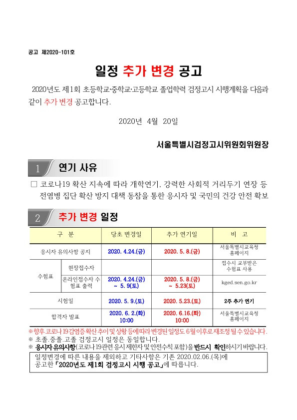 ※ 일정변경에 따른 내용을 제외하고 기타사항은 기존 2020.02.06(목)에 공고한 「2020년도 제1회 검정고시 시행 공고」에 따릅니다.