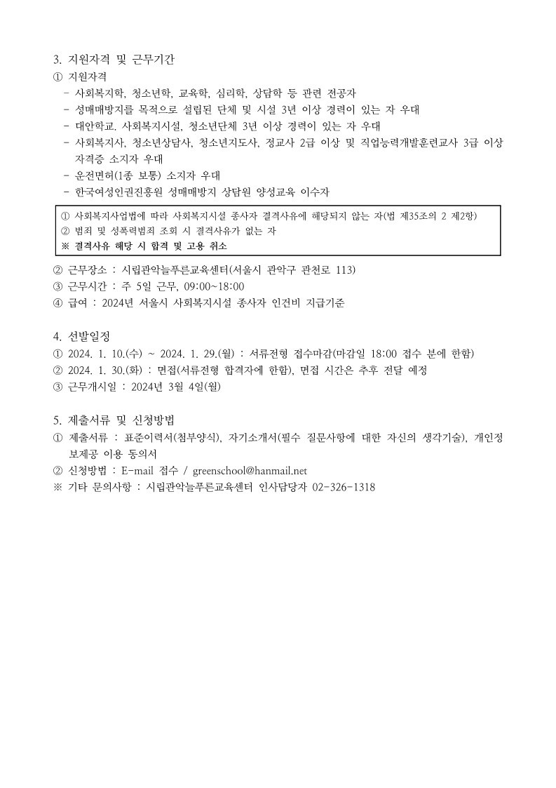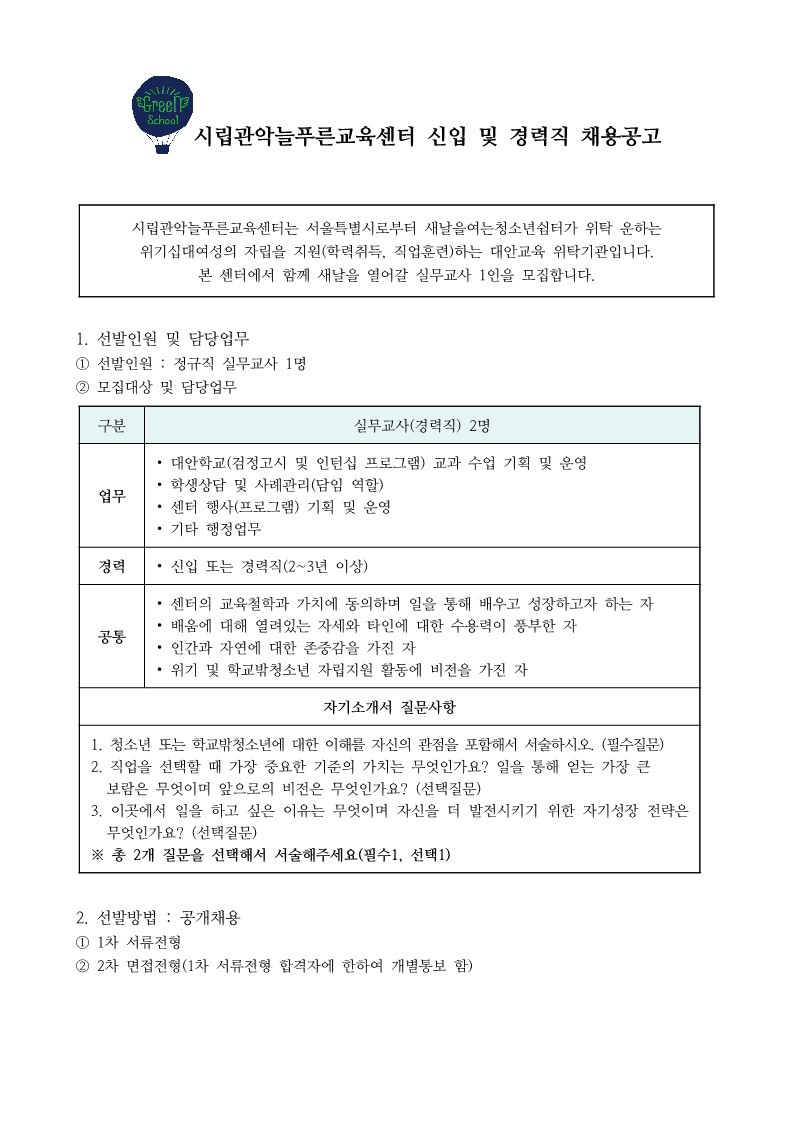 DATE : 2024-01-10 14:30 WRITER : 관리자 VIEW : 1195 시립관악늘푸른교육센터 실무교사(신입 및 경력직) 채용공고 첨부파일 24-1차 채용공고_실무교사(신입 및 경력직)_1.jpg (151.72 KB) 24-1차 채용공고_실무교사(신입 및 경력직)_2.jpg (120.81 KB) 24-1차 채용공고_실무교사(신입 및 경력직).hwp (109.00 KB) 24-1차 채용공고_첨부서류(표준이력서 등).hwp (53.50 KB) 목록 다음 시립관악늘푸른교육센터 검정고시 교과 강사 채용 공고(국어, 수학, 과학) 이전 2023년 관악늘푸른교육센터 2차 추경예산공고 로그인 후 댓글을 작성할 수 있습니다.