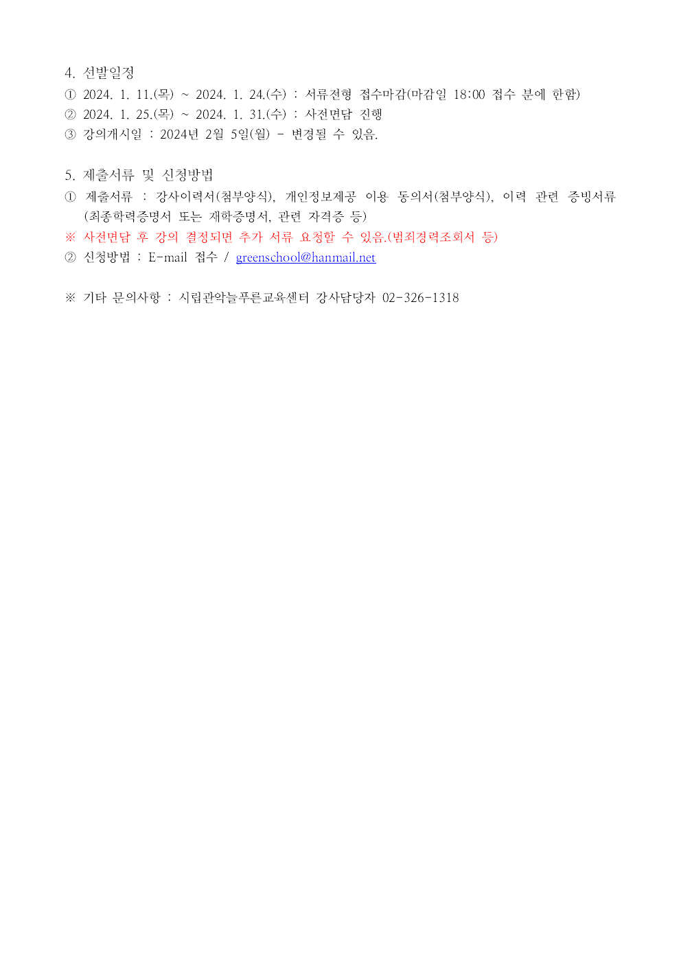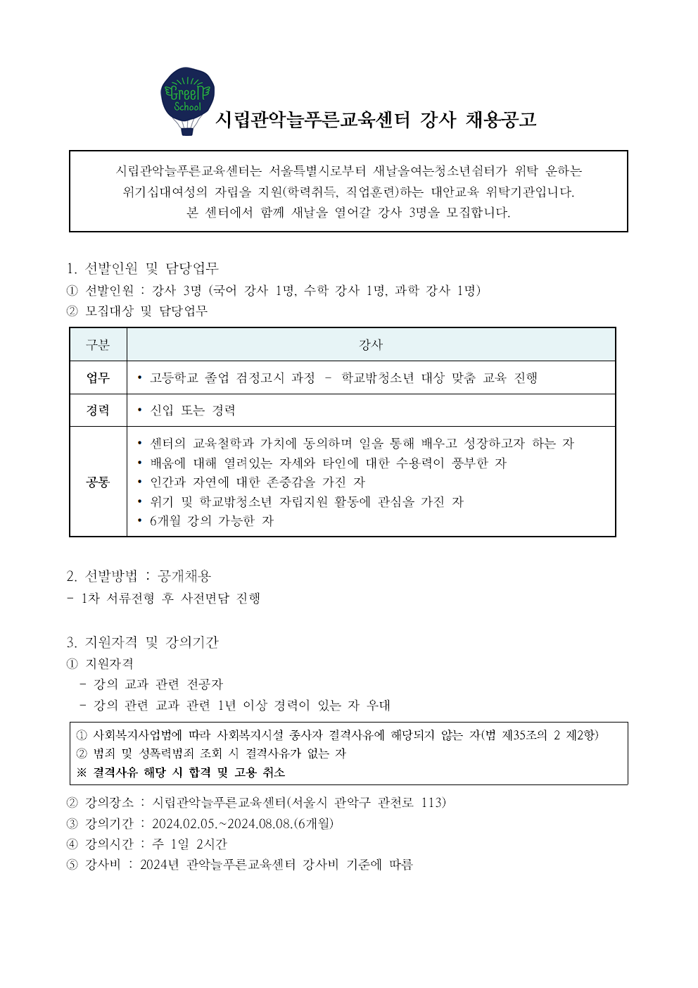 DATE : 2024-01-11 10:41 WRITER : 관리자 VIEW : 1049 시립관악늘푸른교육센터 검정고시 교과 강사 채용 공고(국어, 수학, 과학) 첨부파일 강사채용공고(2024.01)001.png (140.06 KB) 강사채용공고(2024.01)002.png (57.73 KB) (양식)이력서 및 개인정보수집활용동의서.hwp (30.00 KB) 목록 다음 2024년 관악늘푸른교육센터에서 신입생을 모집합니다!! 이전 시립관악늘푸른교육센터 실무교사(신입 및 경력직) 채용공고 로그인 후 댓글을 작성할 수 있습니다.