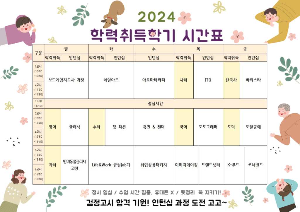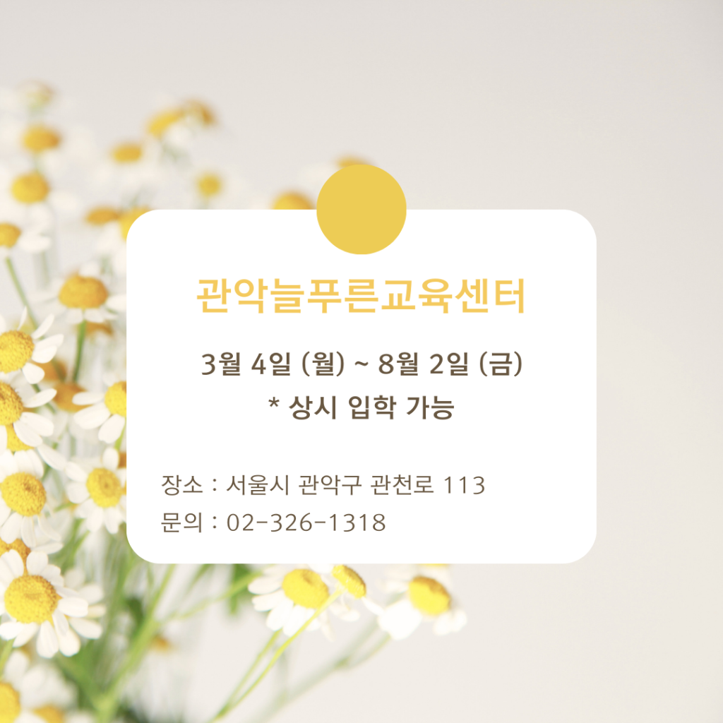 DATE : 2024-03-05 10:03 WRITER : 관리자 VIEW : 1214 2024 학력취득학기가 시작되었습니다!! 2024년도 관악늘푸른교육센터는 활짝 열려있습니다! 입학은 언제나 가능하오니 많은 문의 바랍니다! 첨부파일 시간표(강사명 없음).png (322.21 KB) Notice.png (610.50 KB) 목록 다음 [2024-1] 늘푸른 2024년 1분기 뉴스레터🌱 이전 2024년 관악늘푸른교육센터에서 신입생을 모집합니다!! 로그인 후 댓글을 작성할 수 있습니다.