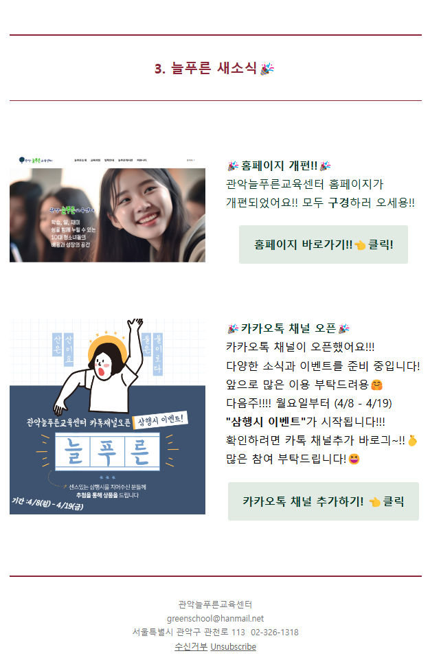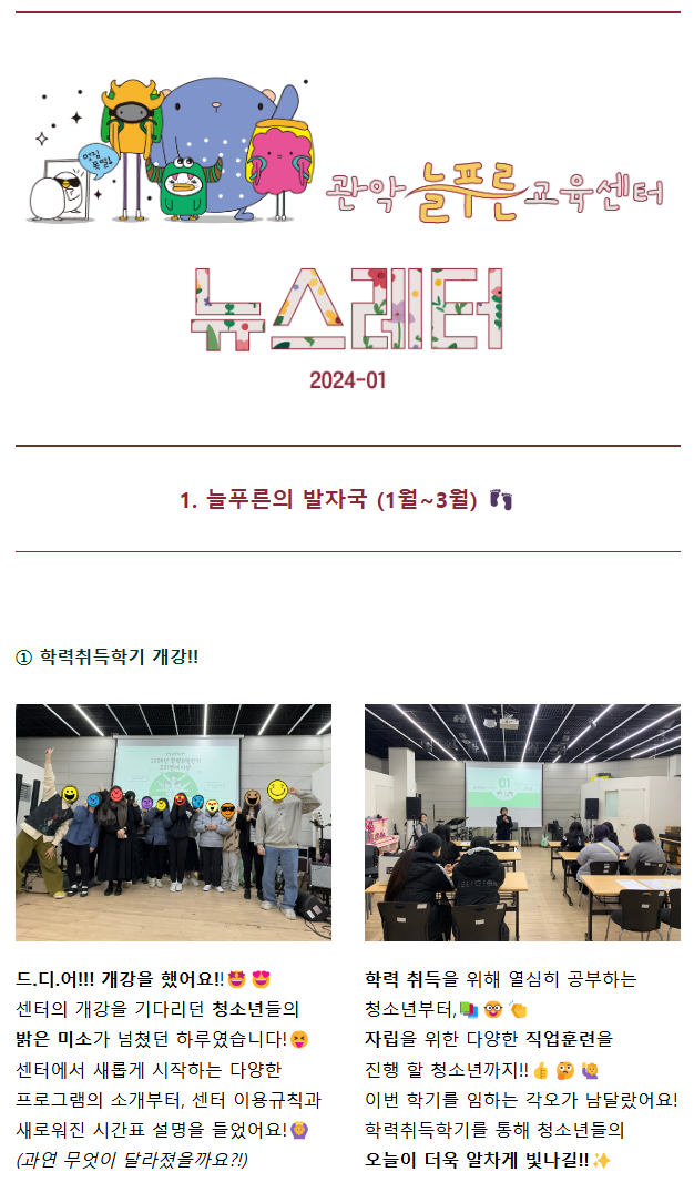 DATE : 2024-04-04 14:04 WRITER : 관리자 VIEW : 1582 [2024-1] 늘푸른 2024년 1분기 뉴스레터🌱 👇👇👇👇👇2024년 2분기 뉴스레터 바로가기👇👇👇👇👇 https://stib.ee/KHeD 첨부파일 5.png (149.85 KB) 4.png (153.35 KB) 2.png (368.31 KB) 1.png (333.86 KB) 3.png (401.40 KB) 목록 다음 [2024-2] 늘푸른 2024년 2분기 뉴스레터🌊 이전 제11회 2024 서울시 십대여성 진로체험축제 "늘푸른적사고"💙 로그인 후 댓글을 작성할 수 있습니다.