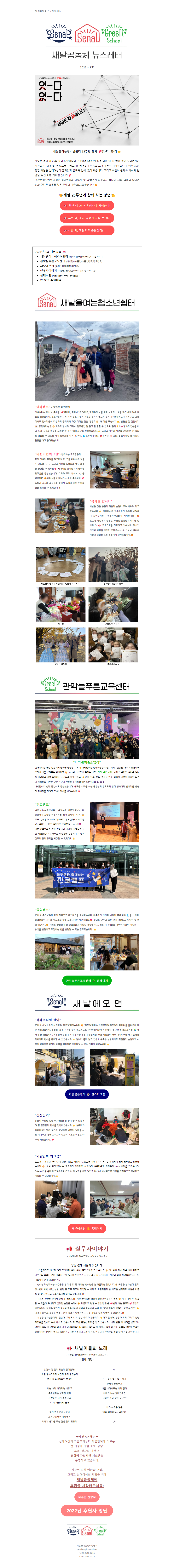 DATE : 2023-03-21 15:47 WRITER : 관리자 VIEW : 812 2023 - 1호 새날 뉴스레터 https://stib.ee/mfs6 첨부파일 23-1 새날 뉴스레터.png (3.29 MB) 목록 다음 2022년 새날을여는청소년쉼터 결산보고서 이전 관악늘푸른교육센터에서 진로특강을 진행합니다!! 로그인 후 댓글을 작성할 수 있습니다.
