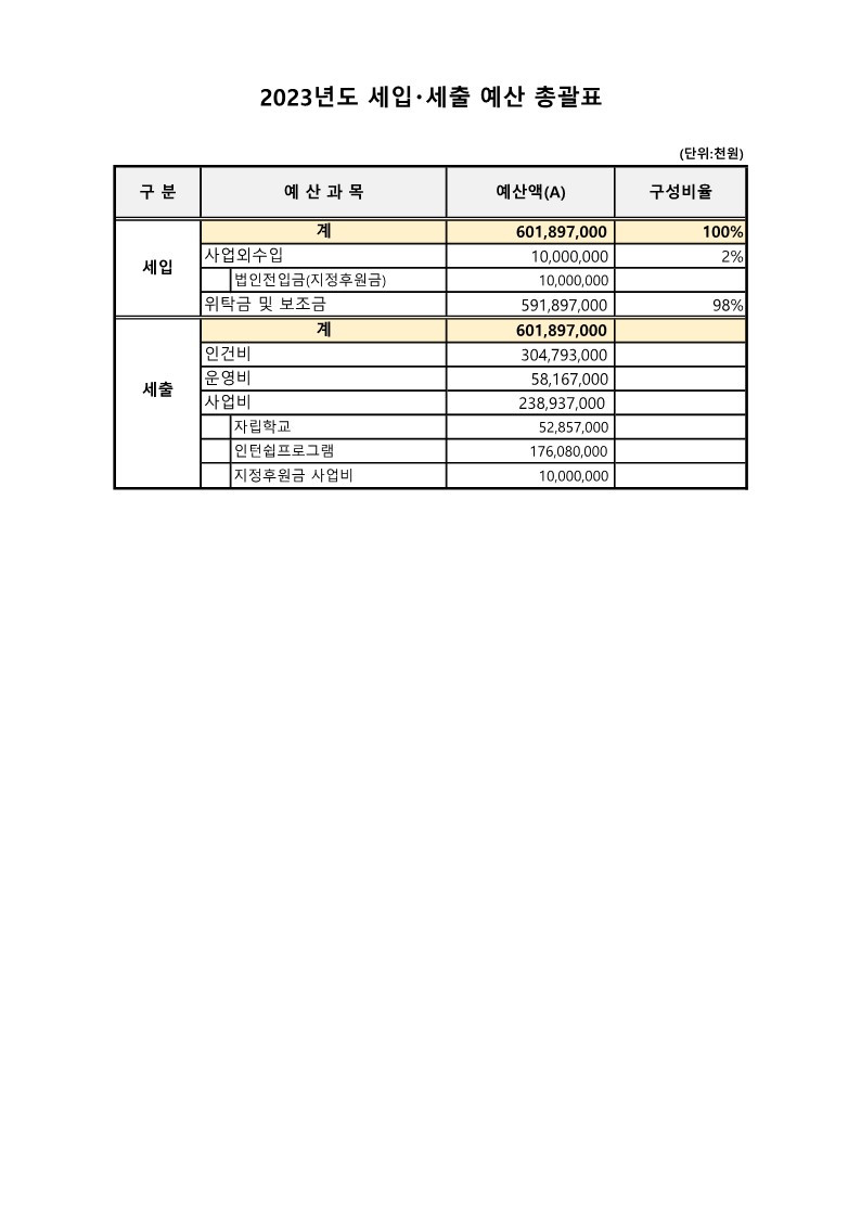 DATE : 2023-05-18 17:39 WRITER : 관리자 VIEW : 899 2023년 관악늘푸른교육센터 예산공고 첨부파일 2023년 예산총괄표.jpg (77.26 KB) 목록 다음 2023년 쇼미더잡스10 홍보영상 이전 2022년 관악늘푸른교육센터 결산공고 로그인 후 댓글을 작성할 수 있습니다.