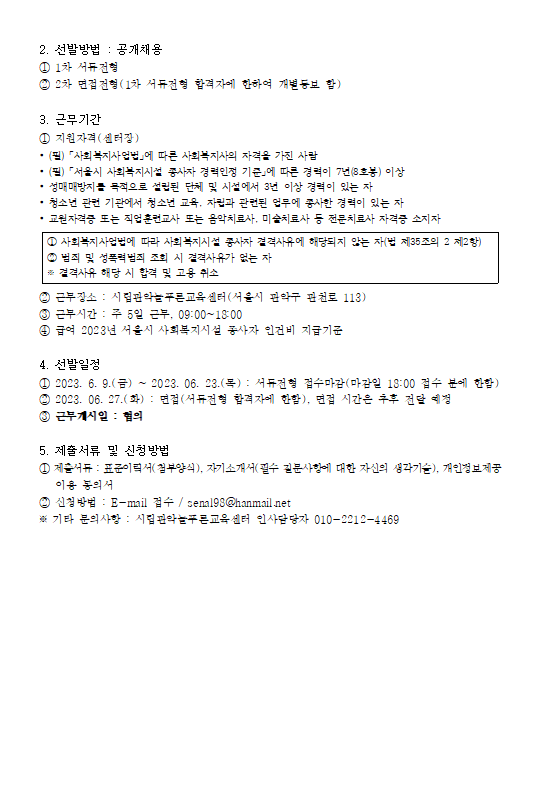 DATE : 2023-06-30 18:41 WRITER : 관리자 VIEW : 1080 시립관악늘푸른교육센터 센터장 채용 공고 첨부파일 채용공고_2.png (46.84 KB) 채용공고_1.png (70.45 KB) 23-1차 채용공고_센터장_20230609.hwp (1.06 MB) 채용공고_첨부서류(표준이력서 등)_센터장.hwp (43.00 KB) 목록 다음 2023 - 2호 새날 뉴스레터 이전 2023년 쇼미더잡스10 홍보영상 로그인 후 댓글을 작성할 수 있습니다.