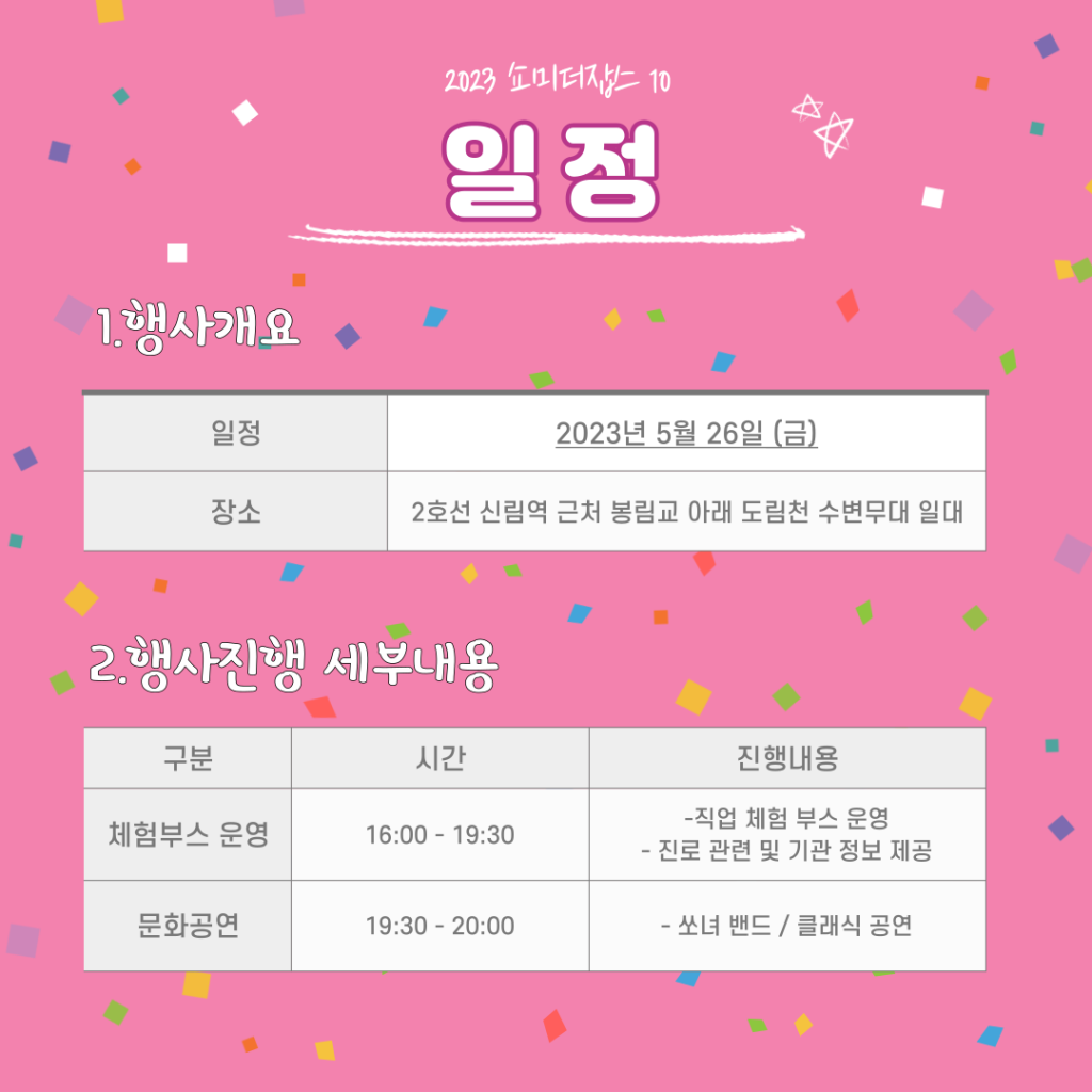 DATE : 2023-05-18 17:29 WRITER : 관리자 VIEW : 856 2023년 제10회 십대여성직업체험축제를 진행합니다!! 2023 ‘쇼미더잡스10' 사전 참가신청서도 많은 신청 부탁드립니다!! ??????????? https://forms.gle/aRQ4srNR3zu6xQMq5 첨부파일 쇼미더잡스포스터_202304.jpg (406.30 KB) 002.png (169.02 KB) 제목을 입력해주세요_-001 (1).png (166.37 KB) 제목을-입력해주세요_-003.png (158.08 KB) 목록 다음 2022년 관악늘푸른교육센터 결산공고 이전 2023년 학력취득학기가 시작되었습니다!! 로그인 후 댓글을 작성할 수 있습니다.