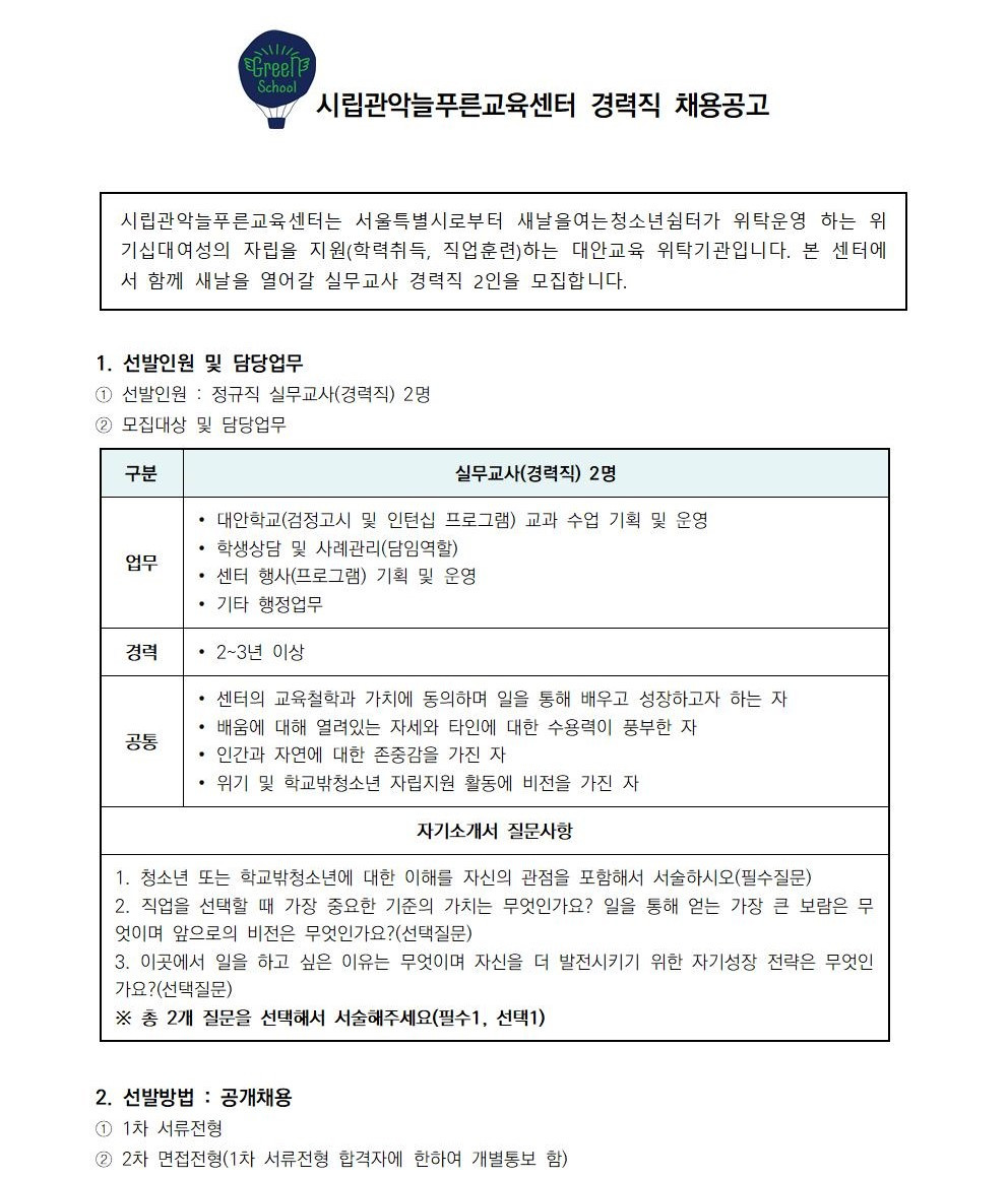 DATE : 2022-11-17 10:42 WRITER : 관리자 VIEW : 1517 시립관악늘푸른교육센터 실무교사(경력직) 채용공고 첨부파일 22-4차 채용공고_실무교사(경력직)_20221115001(편집).jpg (216.98 KB) 22-4차 채용공고_실무교사(경력직)_20221115002(편집2).jpg (175.03 KB) 22-4차 채용공고_실무교사(경력직)_20221115.hwp (1.06 MB) 채용공고_첨부서류(표준이력서 등).hwp (89.50 KB) 22-4차 채용공고_실무교사(경력직)_20221115002.jpg (203.39 KB) eed836e82c444852fbee6b1034dda51b4ac18951[1].jpg (216.76 KB) 목록 다음 실무교사 채용 최종합격자 공고 이전 늘푸른뉴스레터(2022년 후반기) 로그인 후 댓글을 작성할 수 있습니다.