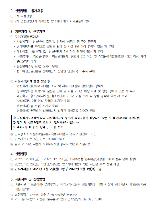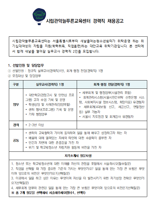 DATE : 2022-12-09 14:18 WRITER : 관리자 VIEW : 1234 시립관악늘푸른교육센터 경력직 채용공고 첨부파일 채용공고 1.png (71.38 KB) 채용공고 2.png (73.99 KB) 22-5차 채용공고_실무교사(경력직)_20221209.hwp (1.07 MB) 채용공고_첨부서류(표준이력서 등).hwp (89.50 KB) 목록 다음 실무교사 채용 최종합격자 공고 이전 늘푸른뉴스레터(2022년 후반기) 로그인 후 댓글을 작성할 수 있습니다.