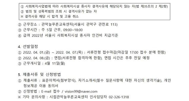 DATE : 2022-04-01 18:11 WRITER : 관리자 VIEW : 1445 시립관악늘푸른교육센터 실무교사(경력직) 채용공고(연장) 첨부파일 채용공고(연장)1.jpg (104.72 KB) 채용공고(연장)2.jpg (50.50 KB) 22-1차 채용공고_실무교사_20220401(연장).hwp (1,011.50 KB) 채용공고_첨부서류(표준이력서 등) (8).hwp (19.50 KB) 목록 다음 실무교사 (팀장) 채용 최종합격자 공고 이전 늘푸른뉴스레터(2022년 후반기) 로그인 후 댓글을 작성할 수 있습니다.