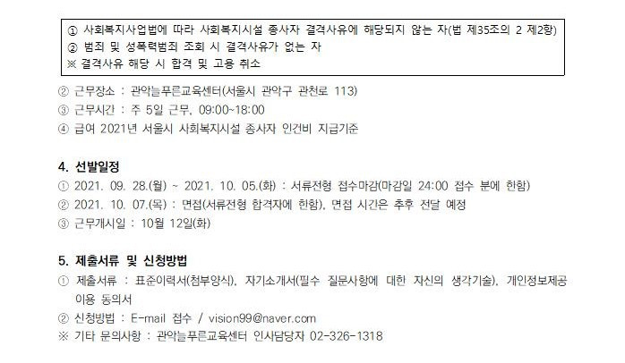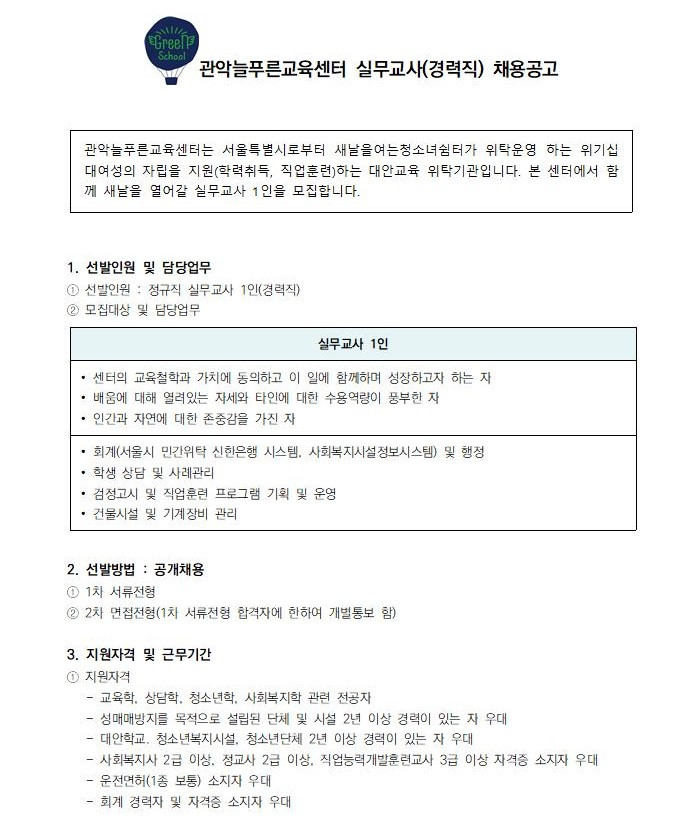 DATE : 2021-09-28 19:48 WRITER : 관리자 VIEW : 1927 관악늘푸른교육센터 실무교사(경력직) 채용공고(연장) * 이력서 등 첨부서류는 첨부파일을 확인하시기 바랍니다. 첨부파일 채용공고_관악늘푸른교육센터-실무교사(20211007)-재공고반1.jpg (118.03 KB) 채용공고_관악늘푸른교육센터-실무교사(20211007)-재공고반2.jpg (65.25 KB) 채용공고_첨부서류(표준이력서 등).hwp (36.50 KB) 목록 다음 21-03호 뉴스레터 이전 늘푸른뉴스레터(2022년 후반기) 로그인 후 댓글을 작성할 수 있습니다.