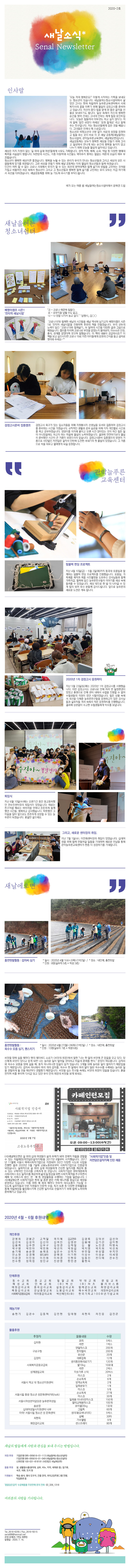 DATE : 2020-07-24 14:18 WRITER : 관리자 VIEW : 1946 2020년 2분기 새날소식지 첨부파일 2020 소식지 2분기-웹.jpg (1.89 MB) 2020 소식지 2분기-웹2.jpg (1.88 MB) 목록 다음 재개강(1단계) 안내문 이전 외부인턴십(연작) 안내문 로그인 후 댓글을 작성할 수 있습니다.