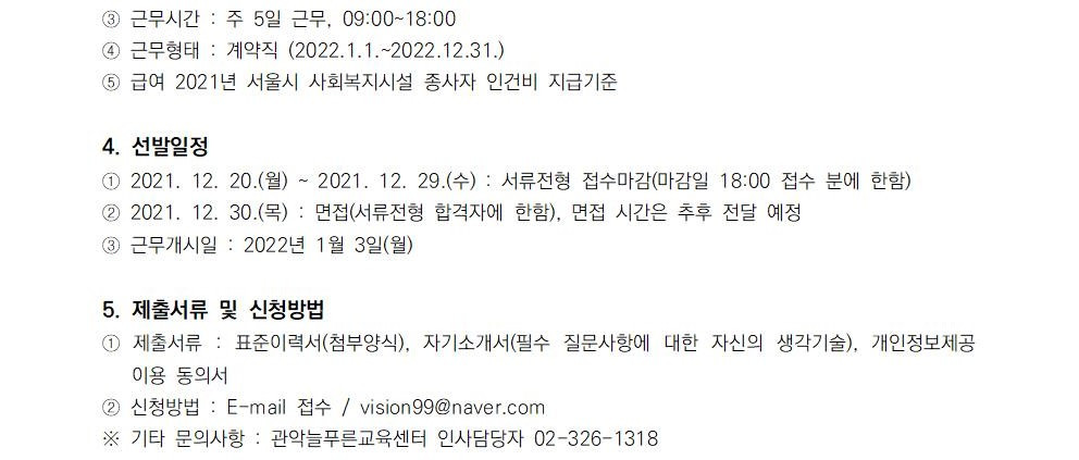 DATE : 2021-12-20 17:09 WRITER : 관리자 VIEW : 1791 관악늘푸른교육센터 실무교사(육아휴직대체) 채용공고 첨부파일 채용공고_관악늘푸른교육센터-실무교사-육아휴직대체(2021.12001.jpg (222.04 KB) 채용공고_관악늘푸른교육센터-실무교사-육아휴직대체(2021.12002.jpg (80.36 KB) 채용공고_첨부서류(표준이력서 등).hwp (19.50 KB) 목록 다음 실무교사(육아대체직) 채용 최종합격자 공고 이전 늘푸른뉴스레터(2022년 후반기) 로그인 후 댓글을 작성할 수 있습니다.