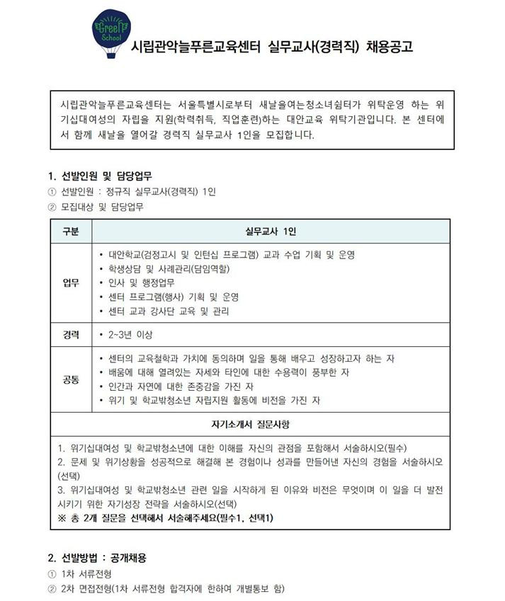 DATE : 2022-06-14 12:39 WRITER : 관리자 VIEW : 1305 시립관악늘푸른교육센터 실무교사(경력직) 채용공고 첨부파일 채용공고 편집이미지1.jpg (118.58 KB) 채용공고 편집이미지2.jpg (81.56 KB) 22-2차 채용공고_실무교사(경력직)_20220613.hwp (1.06 MB) 채용공고_첨부서류(표준이력서 등).hwp (89.50 KB) 목록 다음 시립관악늘푸른교육센터 실무교사(경력직) 채용공고(연장) 이전 늘푸른뉴스레터(2022년 후반기) 로그인 후 댓글을 작성할 수 있습니다.