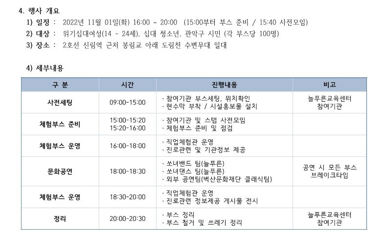 DATE : 2022-10-21 15:47 WRITER : 관리자 VIEW : 1295 관악늘푸른교육센터에서 2022년 제10회 십대여성직업체험축제를 진행합니다! 첨부파일 2022년 쇼미더잡스 개요_관악늘푸른교육센터(최종)_2.jpg (86.79 KB) 2022년 쇼미더잡스 개요_3.jpg (96.33 KB) 최종4.jpg (402.06 KB) 목록 다음 2022 십대여성직업체험축제 "쇼미더잡스10" 홍보영상 이전 늘푸른뉴스레터(2022년 후반기) 로그인 후 댓글을 작성할 수 있습니다.