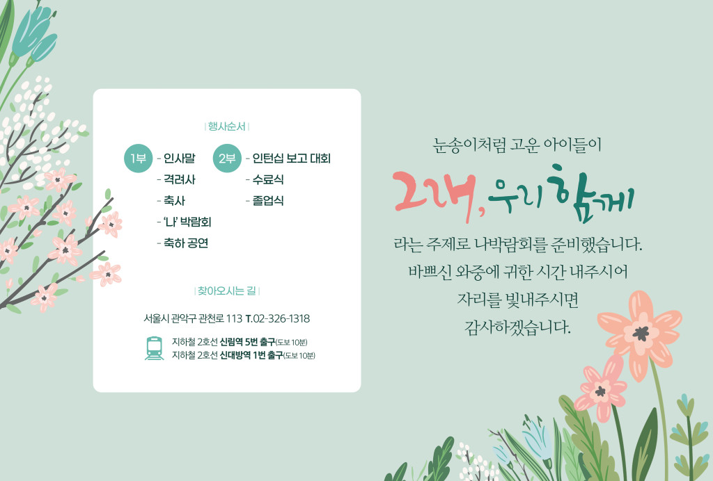 DATE : 2022-12-05 12:24 WRITER : 관리자 VIEW : 956 관악늘푸른교육센터에서 나박람회를 개최합니다. 첨부파일 KakaoTalk_20221205_095602607.jpg (122.81 KB) KakaoTalk_20221205_095602607_01.jpg (119.23 KB) 목록 다음 시립관악늘푸른교육센터 경력직 채용공고 이전 늘푸른뉴스레터(2022년 후반기) 로그인 후 댓글을 작성할 수 있습니다.
