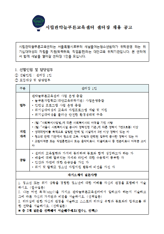 DATE : 2023-06-30 18:41 WRITER : 관리자 VIEW : 1081 시립관악늘푸른교육센터 센터장 채용 공고 첨부파일 채용공고_2.png (46.84 KB) 채용공고_1.png (70.45 KB) 23-1차 채용공고_센터장_20230609.hwp (1.06 MB) 채용공고_첨부서류(표준이력서 등)_센터장.hwp (43.00 KB) 목록 다음 2023 - 2호 새날 뉴스레터 이전 2023년 쇼미더잡스10 홍보영상 로그인 후 댓글을 작성할 수 있습니다.
