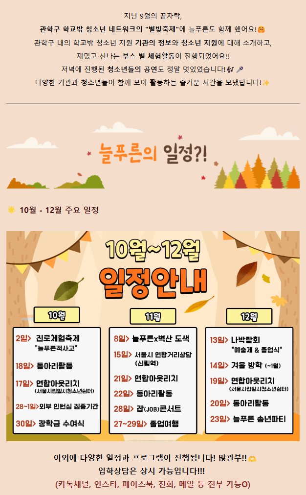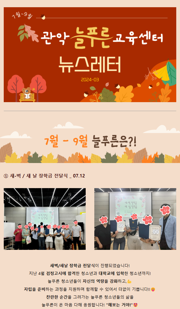 DATE : 2024-10-31 03:05 WRITER : 관리자 VIEW : 1157 [2024-3] 늘푸른 2024년 3분기 뉴스레터🍂 👇👇👇👇👇2024년 3분기 뉴스레터 바로가기 클릭!!👇👇👇👇👇 https://stib.ee/mE0F 첨부파일 blobid1730354542731.png (336.77 KB) blobid1730354552574.png (771.78 KB) blobid1730354633811.png (542.42 KB) blobid1730354670313.png (817.22 KB) blobid1730354677485.png (898.47 KB) blobid1730354687097.png (194.98 KB) blobid1730354694360.png (30.36 KB) 목록 다음 [한국여성인권진흥원] 2024년 여성폭력 추방주간 이전 제11회 2024 서울시 십대여성 진로체험축제 "늘푸른적사고"💙 로그인 후 댓글을 작성할 수 있습니다.