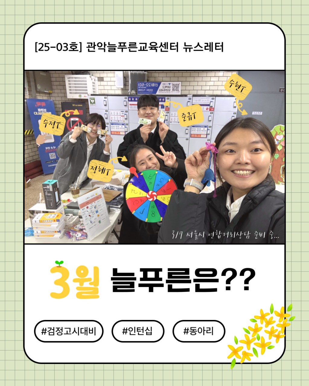 DATE : 2025-04-11 00:00 WRITER : 관리자 VIEW : 851 [뉴스레터] 2025-03호 관악늘푸른교육센터 3월 뉴스레터🌸 3월 뉴스레터🌸 바로가기 (👈클릭!!) 2025- 03호 뉴스레터가 발행되었습니다. 이번 뉴스레터는 2025년 3월의 이야기를 담았습니다!어떤 다양한 이야기들이 생겨났을까요~?! ☺️ 첨부파일 mceclip0.png (931.15 KB) 목록 다음 [공동체캠프 후기] 2025년 공동체캠프 다녀왔습니다!! 이전 [캠프안내] 늘푸른 공동체캠프 안내 로그인 후 댓글을 작성할 수 있습니다.