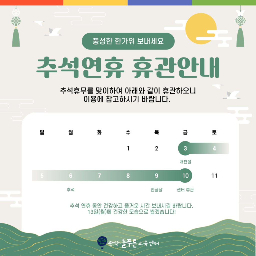 추석 연휴 기간 동안 센터 운영이 잠시 쉬어갑니다.