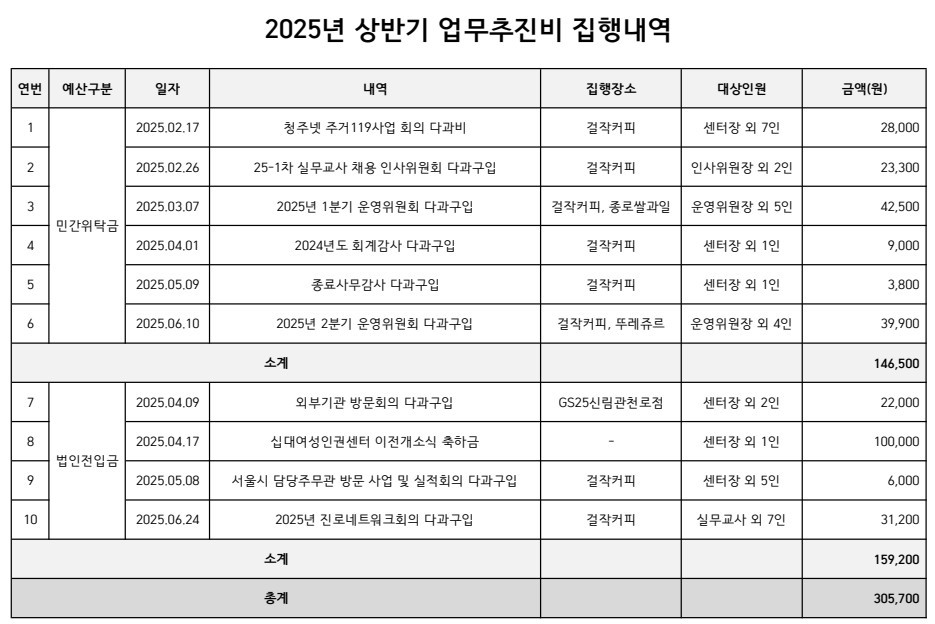 DATE : 2025-07-04 00:00 WRITER : 관리자 VIEW : 63 2025년 상반기 업무추진비 집행내역 서울특별시 민간위탁 사무 예산·회계 및 인사·노무 운영 매뉴얼에 의하여 2025년 상반기 업무추진비 집행내역을 공고합니다. 첨부파일 2025년 상반기 업무추진비 집행내역.jpg (120.54 KB) 목록 이전 [예산] 2025년 6차 추경 예산 공고 로그인 후 댓글을 작성할 수 있습니다.