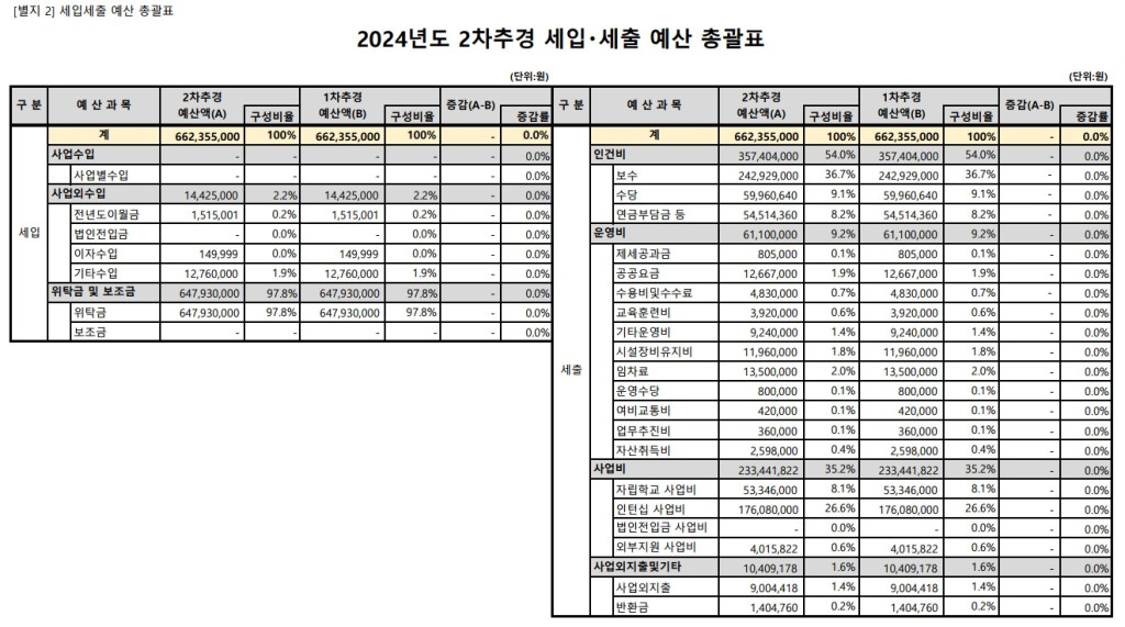 DATE : 2024-08-12 13:32 WRITER : 관리자 VIEW : 975 [예산] 2024년 2차 추경 예산 공고 2024년 세출예산 중, 세목계정 예산전용이 있어 2차 추경 예산을 공고합니다. 첨부파일 blobid1723437111510.jpg (179.29 KB) 목록 다음 [예산] 2024년 3차 추경 예산 공고 이전 [결산] 2023년 관악늘푸른교육센터 세입세출 결산서 공고 로그인 후 댓글을 작성할 수 있습니다.