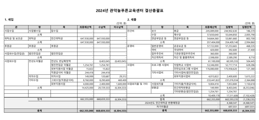 DATE : 2025-03-31 11:37 WRITER : 관리자 VIEW : 480 [결산] 2024년 관악늘푸른교육센터 결산서 공고 2024년도 관악늘푸른교육센터 세입세출 결산서를 공고합니다. 첨부파일 2024년 세입세출 결산서.jpg (125.64 KB) 목록 다음 [센터이용안내] 늘푸른 5월 휴무 안내 이전 [예산] 2025년 2차 추경 예산 공고 로그인 후 댓글을 작성할 수 있습니다.