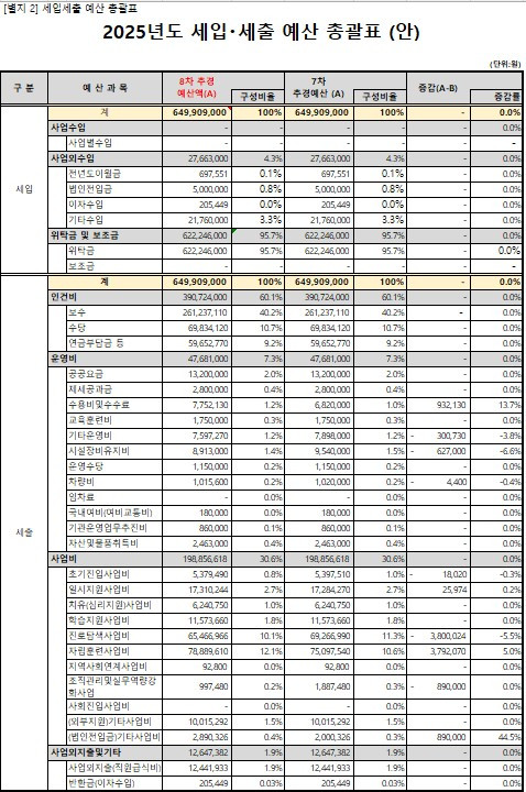 DATE : 2025-12-09 11:29 WRITER : 관리자 VIEW : 30 [예산] 2025년 8차 추경 예산 공고 시립관악늘푸른교육센터에서는 사회복지법인 및 사회복지시설 재무회계규칙 제10조에 의거하여, 2025년 8차 추경 세입·세출예산을 공고합니다. 첨부파일 2025년도 8차 추경 세입세출 예산 총괄표.jpg (155.52 KB) 2025년도 8차 추경 세입세출 예산 총괄표.jpg (155.52 KB) 목록 다음 [예산] 2025년 9차 추경 예산 공고 이전 [예산] 2025년 7차 추경 예산 공고 로그인 후 댓글을 작성할 수 있습니다.