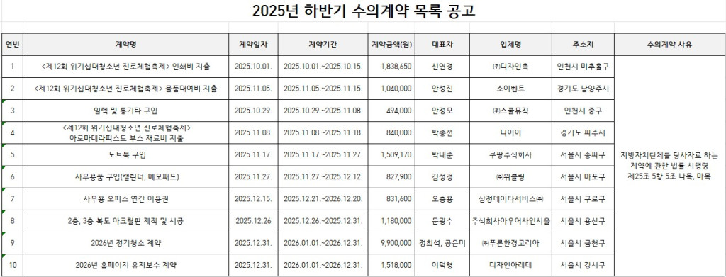 DATE : 2026-01-14 09:51 WRITER : 관리자 VIEW : 14 2025년 하반기 수의계약 목록 공고 첨부파일 2025년 하반기 수의계약 목록 공고.jpg (121.72 KB) 목록 이전 2025년 하반기 업무추진비 집행내역 로그인 후 댓글을 작성할 수 있습니다.